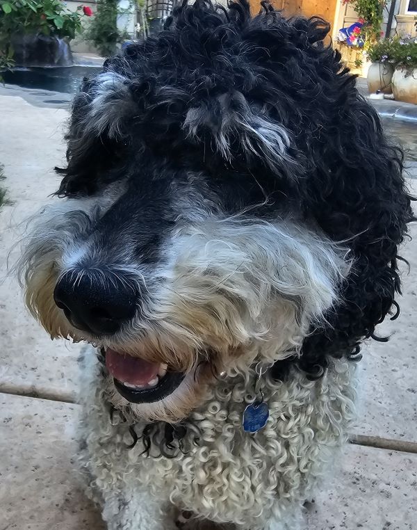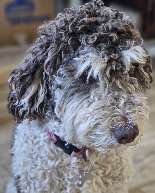 Arial : 4th generation parti tri colored. 45lbs curley wavey. Wonder full loving dog. Loves to watch TV. Favorite show is AFV. She is always