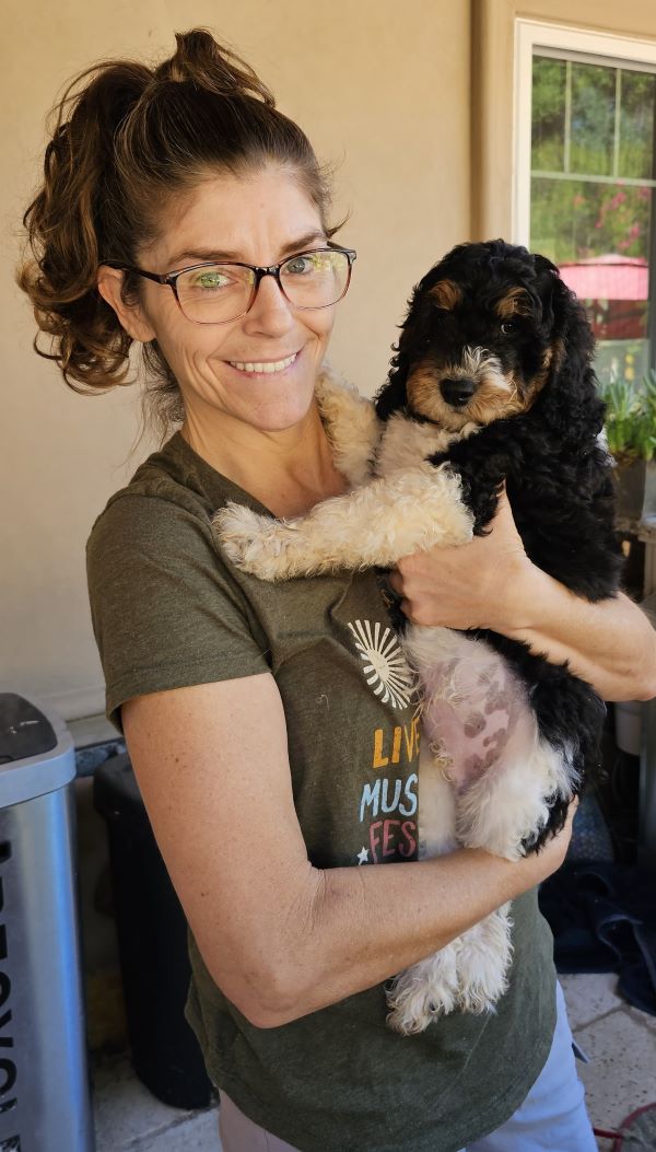 Beautiful chocolate, white and cream multi coloring She is one of the smallest and is so sweet. Female 30-45 lbs at maturity. Likes to climb into our laps. Very bright and wants to learn